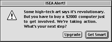 I suggest that the latter is far more revolutionary - that giving the mass of the population the tools to communicate more effectively is something that can change society far more fundamentally than an added advantage for an already priveliged elite. Isn't it closer to the truth to admit that we, digital artists and people promoting digital arts, are a well financed, highly priveliged, arty clique who want to play with expensive techno toys whatever the cost and whatever the implications. So my thesis, that forms the basis of this presentation, is that much current digital art does represent a revolution, but it represents a revolution in sales, not a revolution in ideas. The Marketing of Personal ComputersThe personal computer is a marketing man's dream. It's the perfect product, a high price, mass market product which holds out the possibility not just of built-in stylistic obsolesence, as with, say, clothes - which go out of fashion - but also of built-in functional obsolesence. In other words, the product actually stops being able to do the job it's intended for after an artificially reduced period of time. But - and here's the real beauty of this product to the industry - as a manufacturer I can activate this functional obsolesence virtually at will. Simply by encouraging the production of new software and operating system products which require a higher-specification machine, and by withdrawing technical support and sales for older software products, I can render a perfectly functional older machine effectively obsolete. Look at it this way, and you'll see how outrageous the situation is. We've Got a New Type of Clothing..."It's brand new, and it's fantastically fashionable. Hey, it does pretty much the same as your shabby old clothing, with a few extra refinements (though it does take a minute or two longer to put on)."Of course, you're going to need a new washing machine to wash these clothes, but, hey, once you've got that new washer think of all the new, fashionable clothes that you weren't able to wash before. So get in with the in-crowd, and buy yourself a new suit... and a new washing machine, of course." We, digital artists and educators, are the unwitting shock-troops of a massive marketing push. The IT industry is a big, big money industry. Our work, our web pages, our realtime audio, our javascript is being used by that industry to shift more product - and there's absolutely nothing that we can do about it if we don't get smart. Unintended Messages...Let's be aware of the incidental messages that our art is carrying. As artists we may not mean to spread these messages, but they're implicit in our working practices. Let me give you an example: Every time you upload a full-colour JPEG onto the network then whatever its content, whatever the picture depicts, whatever you intend your audience to gather from the image, one of the incidental messages that it's communicating to many of your viewers is "Hey, isn't it about time you splashed out on a new monitor?" The solution the Redundant Technology Initiative puts forward is simple: you don't need to use brand new PC's, you can use PC's that you can afford - that are a few years old, that are cheap or free. But What Can You Do With An Old PC?The next thing that people usually say to me at this point is "Yes, but let's face it, you need the most cutting-edge technology in order to be creative with computers. You can't really do anything exciting with the old stuff." Space probes take many years to get to their desinations, and they have to be designed with reliable, established technology wherever possible. I understand that the recent Mars Rover was controlled by a chip no more powerful than a 286. So when people say, "You can't do anything much interesting with a 286!" I say, "Well, maybe you're right - but instead you could always explore another planet." Just a few years ago we were being sold the equipment that's now languishing in the store cupboard with the promise that we could be creative with it, and now we're being told by the people who sold it to us that that wasn't really true. Or rather, that we can be more creative with their new machine. False Promises of Empowerment"Unlock your creativity with our new multimedia PC!" These high-tech products promise user empowerment. They even use the word "Power" in their names: Power Macintosh, Power PC. Is your creativity locked up? We, computer consumers and users, are beginning to find that these tools which promise empowerment frequently lock us into a distinctly disempowering cycle of upgrade, accelerated obsolesence, replacement, upgrade... We find ourselves outwitted and outgunned by the strategies of technology manufacturers. Perhaps that catchy advertising slogan should really read, "Lock your creativity into our new multimedia PC!" What advertisers are asking you to do is to reconfigure your creative practice in such a way that you are dependent on a new, expensive tool, that you, personally, may not be able to afford. So all of a sudden, whereas before you controlled the tools of your own production on your home office desktop, now your creative tools are owned by your employer, or locked into a finace deal that means you're going to have to spend much of the time that you would have spent making art, making money instead. Or perhaps, more insidiously, you'll carry on making art, receive free computer equipment from a generous high-tech sponsor, but the real meaning of what you're doing will be distorted by the expense of the technology you're using. Your art will be sucked into the process of marketing the machines that you use to create it - perhaps unwittingly, you will have become a product demonstrator. Rushing to upgrade doesn't sound so attractive now, does it? In the end I'm not against corporations, and their making money, I'm against exclusivity. I'm against the side-effects of the IT industry's marketing drive, which delivers expensive, exclusive new c